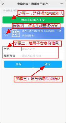 ⑸. 如需添加未成年人請點擊“添加未成年子女”后輸入身份信息并點擊確認,再點擊“本人不動產登記情況”
